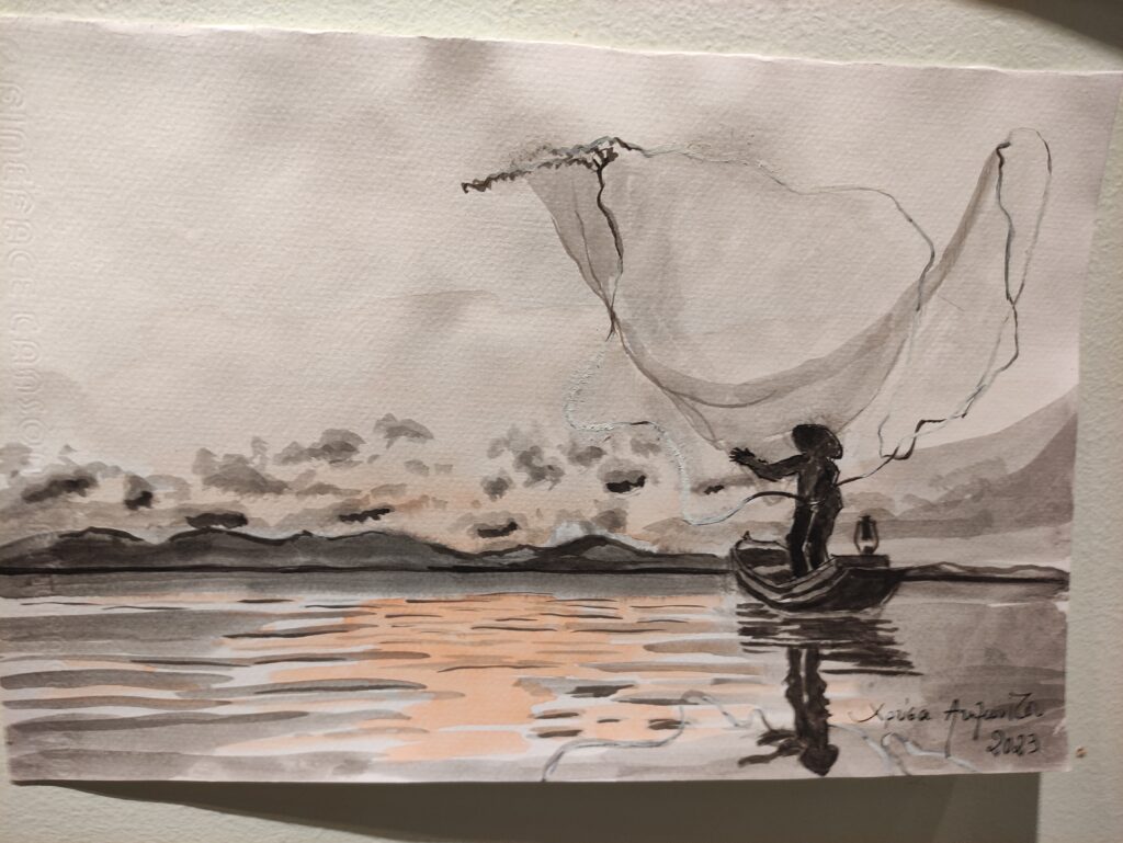 Παράξενα όμορφη. Ο κόσμος των χρωμάτων μονότονος μα προκαλεί το ενδιαφέρον μου. Η παρουσίαση των έργων τόσο διαφορετική. Έργα δημιουργημένα σε χαρτί. Θυμίζουν τα έργα παιδιών νηπιαγωγείου που με το πινέλο στο χέρι, απορροφημένα από τη μαγεία των χρωμάτων, περνούν ξανά και ξανά το πινέλο απάνω στο χαρτί ακολουθώντας τα ίχνη του. Οι εικόνες συγκεχυμένες, δυσκολεύομαι τόσο να κατανοήσω. Η ματιά γρήγορη, βιαστική χαϊδεύει κάθε τοποθετημένο χαρτί μέχρι τη στιγμή που η πόρτα της φαντασίας μου δημιουργεί τη σχισμή εκείνη που επιτρέποντας στη λογική να ξεκουραστεί ξεκινά η απόλαυση της αρμονίας των σχημάτων, των αποτυπωμάτων, των γραμμών…..