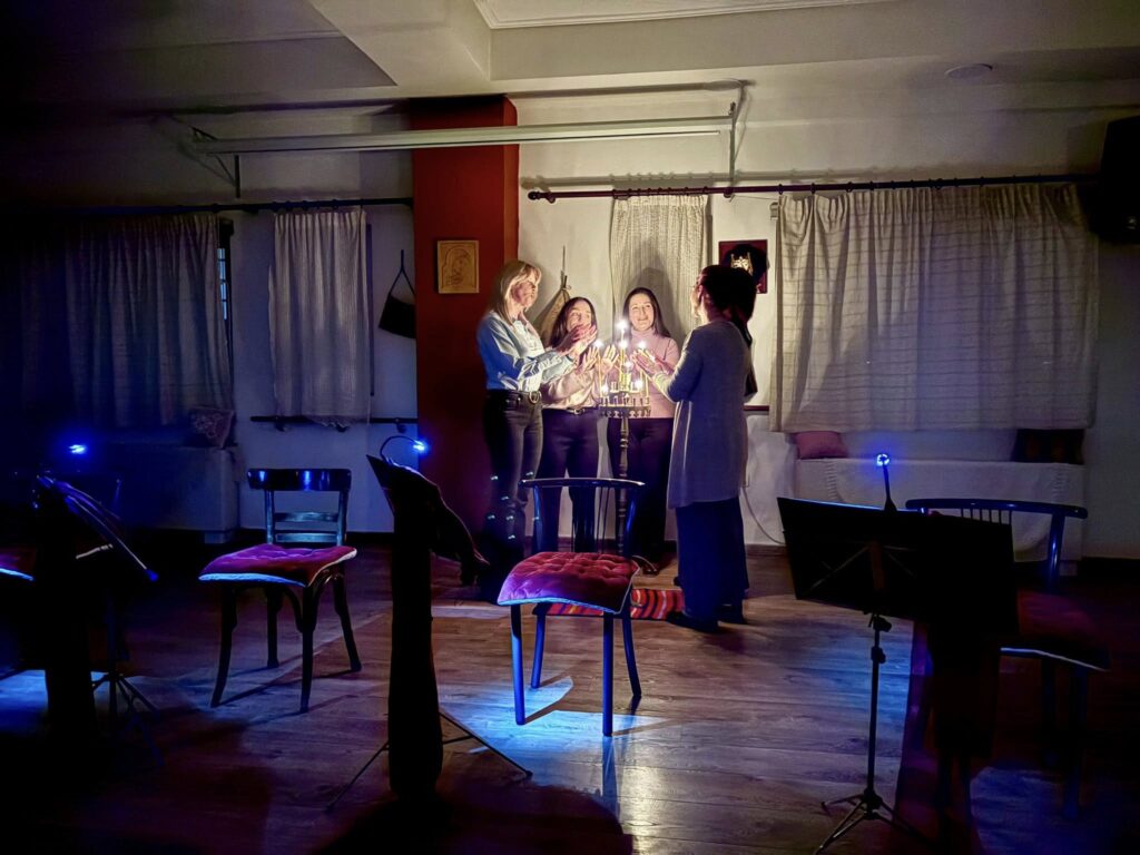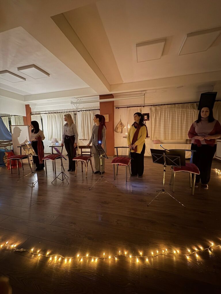 Η αίθουσα που συνήθως δονείται από ήχους παραδοσιακών τραγουδιών και σείεται παραδοσιακών χορευτικών μοτίβων, σήμερα σιωπηλή και μυσταγωγική.Τα χριστουγεννιάτικα φωτάκια, η διαχωριστική γραμμή σκηνής και πλατείας, το τοποθετημένο μανουάλι, η μυσταγωγία της στιγμής, το κατάλευκο κάδρο, η έκπληξη της βραδιάς, και οι καρέκλες με τα αναλόγια, οι θέσεις των αφηγητών, η δε πλατεία, γεμάτη με τη ζεστασιά του καφενείου ενός μικρού χωριού.